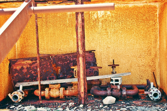 Visited 24.4.2013 by skkye & jonahi. On the same walk through the village and surrounding hills we also visited this pump station in a clear-watered (I always have to mention about the water color, because it was so different from the water back home and I hope that I will always be amazed by it!) bay surrounded by rocks. That could have been an amazing place for a resort hotel or something. But the Yugoslavs had decided to put up an army base there. Isn't that ridiculous! However, nowadays it looks actually quite beautiful with all that rust. The whole place was surrounded by barbed wire fences, but only the concrete posts remained of it. Probably the metal had monetary value and somebody had stolen it. But I have no idea what this pumping station was used for. I was quite fascinated about the valves, though, and that one door that looks like an owl.